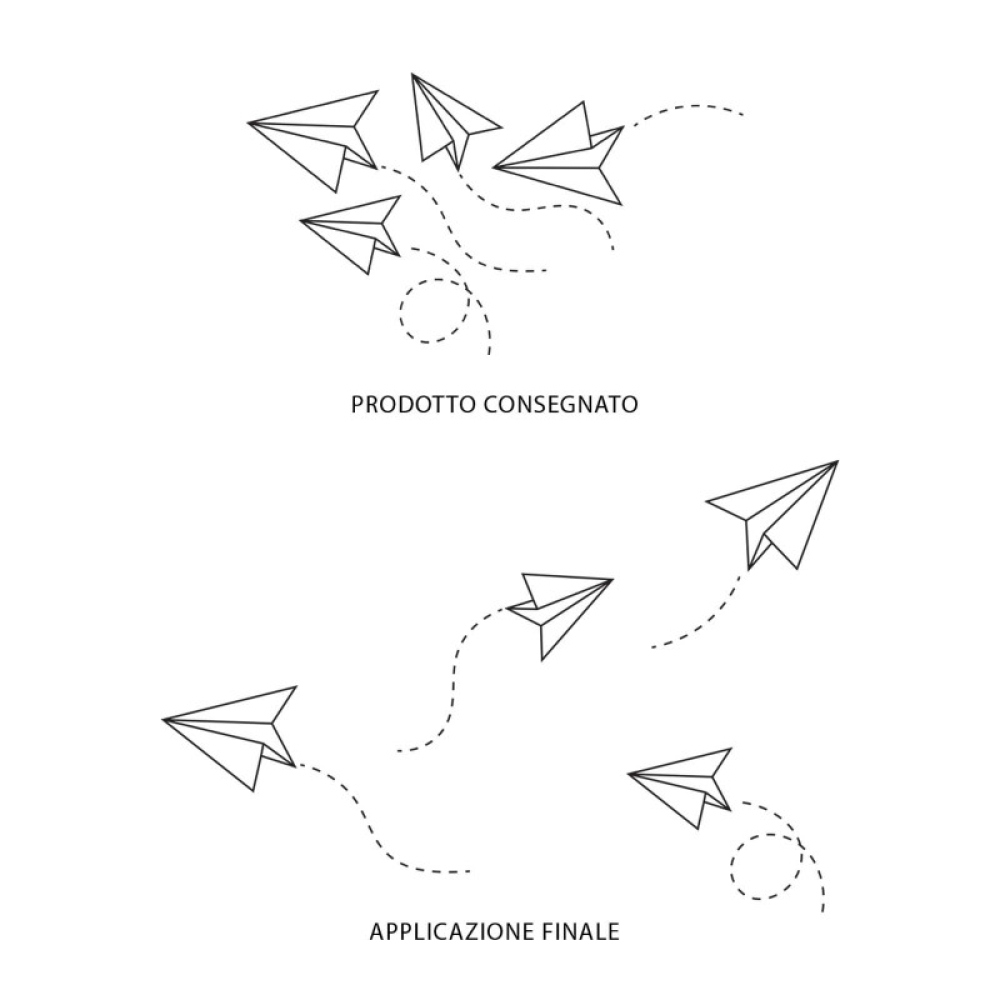 SCEGLI LA SOLUZIONE PIÙ ADATTA A TE Scegli la dimensione e il colore che più fa per te e applica l’adesivo dove vuoi, senza bisogno di alcun strumento aggiuntivo, oppure aiutandoti con una semplice card o carta di credito per farlo aderire meglio alla superficie.Le nostre dimensioni sono sempre indicate come larghezza x altezza e si riferiscono al foglio che ti verrà consegnato. L’adesivo murale "Aeroplani di carta" ti piace ma desidereresti una dimensione o un colore diverso? Contattaci e ti aiuteremo a trovare la soluzione perfetta per te.