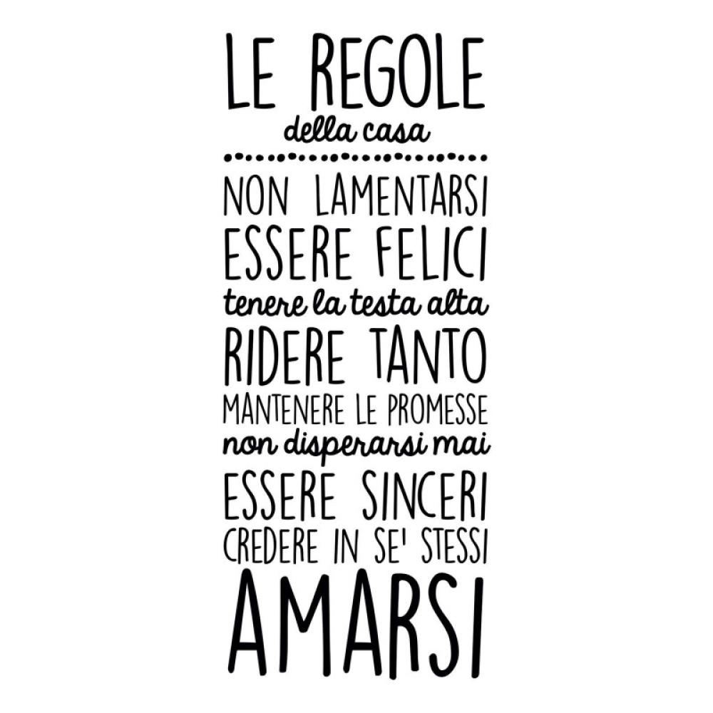 SCEGLI LA SOLUZIONE PIÙ ADATTA A TE Applica i nostri adesivi dove preferisci, senza bisogno di alcun strumento, oppure utilizzando una semplice card o carta di credito per garantire una perfetta adesione alla superficie.Le dimensioni dei nostri prodotti sono sempre indicate come larghezza x altezza e sono sempre associate al foglio che arriverà insieme alla spedizione. L’adesivo murale “Le regole della casa” ti piace ma non presenta le dimensioni o i colori adatti a te? Contattaci e cercheremo di accontentare le tue richieste.