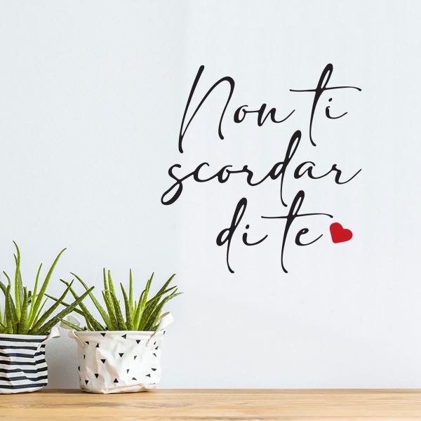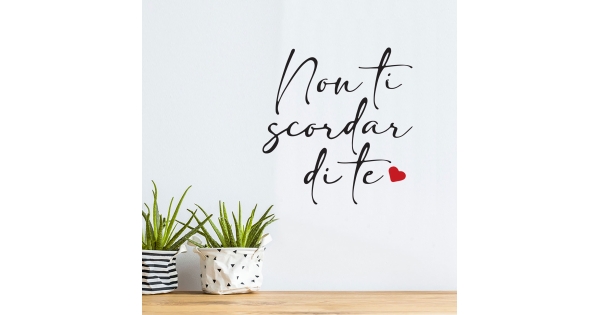 PRODOTTI DI ALTA QUALITÀ Scegli l’adesivo “Non ti scordar di te” Di-arte: facilissimo da applicare e così sottile da poter essere rimosso in modo semplice, senza lasciar alcun segno sulle superfici.I nostri adesivi, 100% Made in Italy, presentano un’elevata qualità, in quanto prodotti con metodi che prevedono un’alta percentuale di lavoro a mano e materiali ricercati e sempre all’avanguardia.Gli adesivi Di-arte sono ottimi per ogni parete della tua casa o del tuo ufficio: semplici, ma allo stesso tempo di grande effetto per dare un tocco unico alle tue stanze. SCEGLI LA SOLUZIONE PIÙ ADATTA A TE Applica il tuo adesivo dove preferisci, servendoti di una semplice card o carta di credito, utile per farlo attaccare meglio alla superficie, dopo aver scelto dimensioni e colore che più fanno per te. Le nostre dimensioni sono sempre associate al foglio di consegna e indicate come larghezza x altezza. Vorresti comprare l’adesivo murale “Non ti scordar di te” ma necessiti di una dimensione o di un colore diverso? Nessun problema, contattaci e cercheremo la soluzione più adatta alle tue esigenze. INDICAZIONI PER L’APPLICAZIONE Grazie all’application tape, pellicola appiccicosa trasparente che viene posta al di sopra dell’adesivo, è possibile, una volta rimossa la carta di supporto, trasferire integralmente, in un’unica soluzione, lo sticker direttamente sul muro.Servendosi di una spatola o anche di una qualsiasi card o carta di credito, dopo aver compiuto un movimento dal centro verso l’esterno, necessario per farlo aderire meglio, è sufficiente rimuovere con cautela la pellicola, sollevandone un bordo e tirando verso l’esterno, e l’adesivo sarà pronto. Hai ancora dubbi sull’applicazione? Segui le istruzioni che ti verranno consegnate con il nostro adesivo e cambia look alla tua casa! I nostri adesivi si adattano perfettamente alle superfici lisce: assicurati, dunque, prima di procedere all’applicazione che essa sia pulita e priva di tracce di polvere.